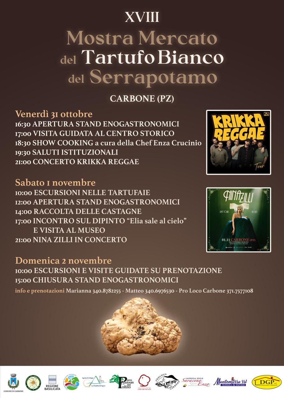 “La XVIII edizione della Mostra Mercato del Tartufo Bianco del Serrapotamo -dice il sindaco di Carbone Mariano Mastropietro- sarà un grande momento di festa per Carbone e per l’intero territorio. È un programma ricco, capace di unire cultura, enogastronomia, natura e spettacolo, con l’obiettivo di offrire a tutti un’esperienza unica nel cuore dell’autunno lucano.